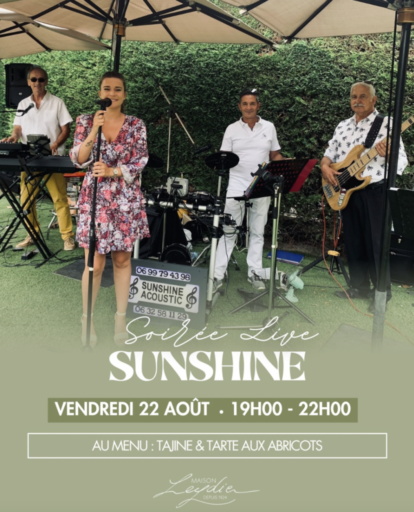 De 19h à 22h, laissez-vous emporter par les rythmes ensoleillés du groupe Sunshine.